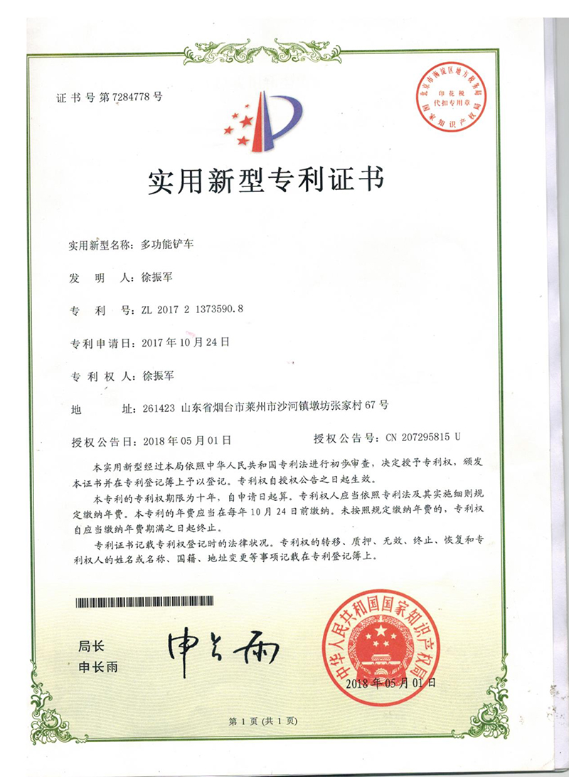 • 获得“多功能铲车抓掉挖一体机”专利证书,开始生产两头忙,搅拌斗装载机,同年更名莱州巨浪机械有限公司